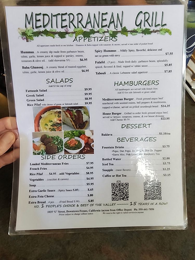 Mediterranean Grill & Cafe offers a diverse menu of Mediterranean and vegetarian dishes, with options for vegan and gluten-free diets. Located in Fresno, CA, the restaurant provides delivery, takeout, and catering services. Customers praise the friendly staff, clean environment, and delicious food. Standout menu items include the spicy chicken, Lebanese chicken, shish kabobs, falafel, and rice pilaf. The restaurant is known for its generous portions and reasonable prices. The ambiance is casual with outdoor seating, free Wi-Fi, and TV for entertainment. Overall, Mediterranean Grill & Cafe is a popular spot for a quick lunch or a gathering with friends, offering a satisfying dining experience with flavorful dishes and excellent service.
